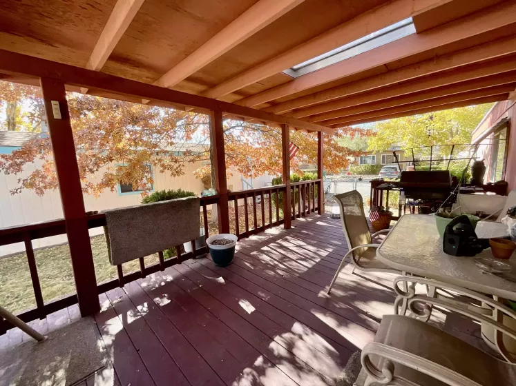 If you love to be outdoors, then you’ll love this charming home! This 2 bedroom/ 2 bath home has been very well maintained and cared for. Home has newer carpet throughout and offers a split floor plan with a bedroom and bathroom on each side of the home. Central kitchen has gas range, dishwasher and stainless refrigerator with eat-in dining area. Formal living room feels spacious with large windows. Laundry room has extra cabinets and come with washer and dryer. Primary bedroom has mirrored closets, and bathroom has large soaking tub and separate step-in shower. Home has central heating and swamp cooler is vented throughout the home. This home has a truly wonderful outdoor space with large, covered deck including built-in skylight! It’s the perfect place to relax on a cool evening and enjoy the beautiful fall colors from the surrounding mature trees. It has a large, fenced yard, storage shed and there is ample parking nearby. This family park is convenient to shopping and restaurants.