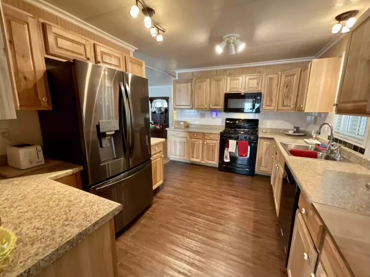 This 2 bedroom, 2 bath home is beautifully appointed and has been lovingly upgraded and maintained. You’ll notice from the moment you arrive it has been meticulously cared for. Home has laminate flooring in main living areas. Kitchen has updated natural wood cabinets and tile back splash and comes with gas range, built in microwave, dishwasher and disposal. Stainless fridge is staying with the home also. Front living room feels spacious and connects with formal dining room and adjacent family room featuring a cozy pellet stove. Seller has had all windows replaced with upgraded low-e energy efficient windows and electrical panel was recently updated. There are 2 bedrooms, and primary bathroom has step-in shower and upgraded vanity. Laundry room has lots of extra storage and a bonus desk area. Outside you’ll love the covered deck, a wonderful place to relax and enjoy the mountain views. Yard is low maintenance and fully fenced. The covered carport has been extended and enclosed and there is an amazing double workshop with power beyond the carport. Home has upgraded plantation shutters, gutters and lots more. This home is in a wonderful 55+ community with amenities such as a pool, spa, clubhouse and more